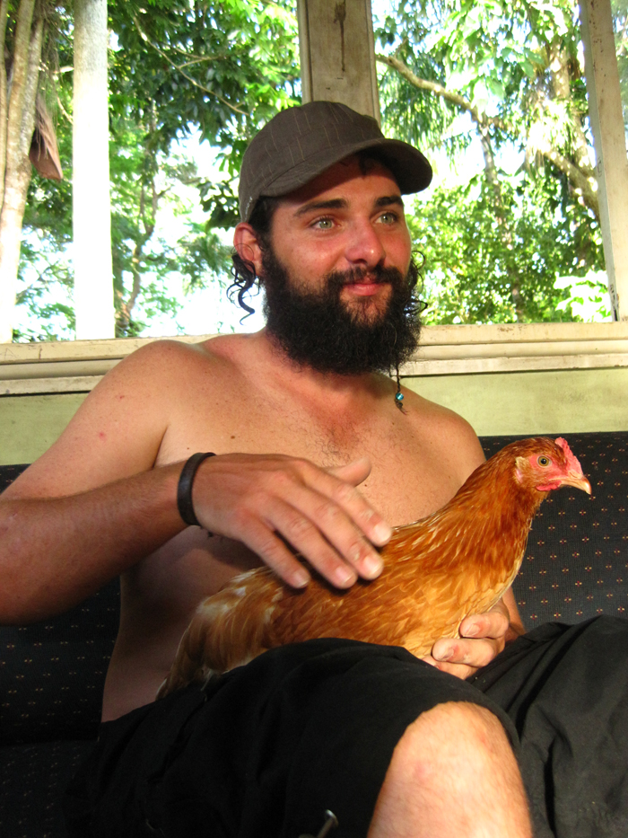 I can't remember the new chicken's name as it's in spanish, which Ben and lowie are learning in prep for a south american trip come end of the year :) I never was good with languages but it's "something roho" and means little red! She's such a rad chicken, unfortunately frizzle passed away the other day from old age, we gave her a burial and Lowie and Ben painted her a sign for her grave :)
